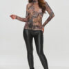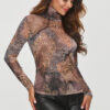 A printed blouse is a distinctive and fashionable proposal, perfect for women who like original patterns and bold stylings. The model has a fitted cut that emphasizes the silhouette, but thanks to the elastic material, it is also comfortable to wear. Made of thin, transparent material, which adds lightness and subtle elegance. Thanks to its semi-transparency, the blouse gains a modern, sensual character. Its characteristic element is a high, ruffled collar, which adds elegance and lightness to it. The entire model is covered with a dynamic pattern, which combines originality with refinement, creating an intriguing, modern effect. Matching the blouse with black leather pants creates a bold, rock look, thus giving the whole outfit a distinctive character. The blouse is perfect for evening outings or for more casual, yet stylish occasions. The pattern and material make it sure to attract attention and emphasize a unique style. The model is available in several color variants, from animal to abstract and floral patterns.