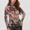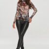 A printed blouse is a distinct and fashionable proposition, ideal for women who like original patterns and bold stylizations. The model has a fitted cut that emphasizes the silhouette, but thanks to the elastic material, it is also comfortable to wear. Made of thin, transparent material, which adds lightness and subtle elegance. Thanks to the semi-transparency, the blouse gains a modern, sensual character. Its characteristic element is a high, ruffled turtleneck, which adds elegance and lightness to it. The whole model is covered with a dynamic pattern that combines originality with refinement, creating an intriguing, modern effect. Combining the blouse with black leather pants creates a bold, rock look, giving the whole an expressive character. The blouse is perfect for evening outings or for more casual but stylish occasions. The pattern and material make it undoubtedly eye-catching and emphasize a unique style. The model is available in several color variants from animal to abstract and floral patterns.