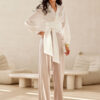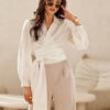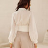 A short blouse with a collar and a lapel neckline, with a tie at the waist and long, puffy sleeves. A cropped length model.