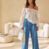 Blouse in the style of a Spanish top with long, puffy sleeves finished with elastic cuffs. It has an elastic band on the neckline, which allows for adjustment and proper regulation. Decorative rose element.