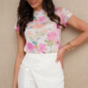 Tulle blouse with short sleeves is a unique piece of clothing that combines lightness and elegance. Made of delicate, semi-transparent material, it subtly emphasizes the silhouette, giving the styling a feminine charm. The round neckline adds a classic character, and the colorful print attracts the eye and gives the blouse a unique expression. Perfect for both everyday wear and special occasions, it goes well with jeans, a skirt, or elegant trousers.
