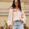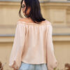 Blouse in the Spanish style with long, billowy sleeves. It has an elastic band at the neckline, which allows for adjustment and proper regulation. Decorative rose element.