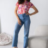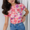 A tulle blouse with short sleeves is a unique item of clothing that combines lightness and elegance. Made of delicate, semi-transparent material, it subtly accentuates the silhouette, giving the outfit a feminine charm. The round neckline adds a classic character, while the colorful print attracts the eye and gives the blouse a unique expression. Perfect for both everyday wear and special occasions, it pairs well with jeans, a skirt, or elegant trousers.