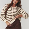 Stylish and timeless women’s striped sweater is a must-have in every wardrobe! The model in a classic combination of two colors fits perfectly into the latest trends, providing comfort and elegance at the same time. Made of soft, pleasant to the touch knitwear, it guarantees comfort throughout the day. The sweater is fastened with decorative buttons in a golden color, which add a unique character to the whole. A looser cut provides freedom of movement, and ribbing at the cuffs and bottom makes the model fit perfectly on the silhouette. Ideal for both jeans and elegant trousers or skirts.
