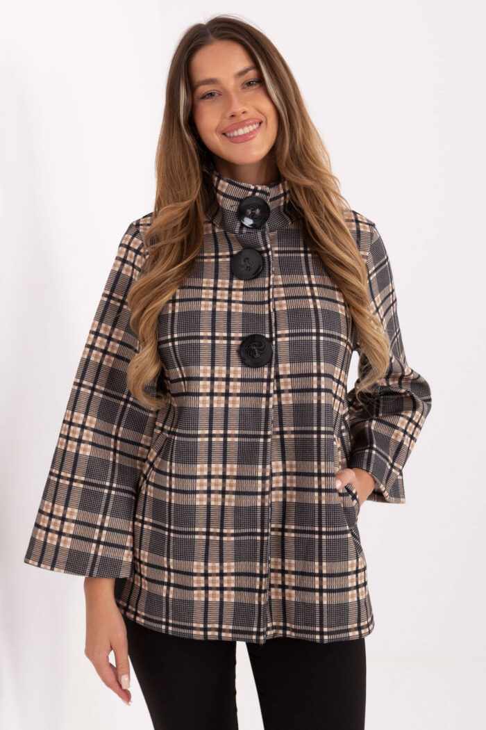 Stylish and timeless women’s checked coat, which is the perfect combination of elegance and classic design. Made of high quality polyester, it is lightweight, pleasant to the touch, and works perfectly in everyday stylizations. The model of standard length and simple cut beautifully fits the silhouette, providing comfort and freedom of movement. Fastening with large buttons adds character to the whole and emphasizes the classic style of the coat. The stand-up collar protects against cold, and the slip pockets are a practical and elegant finish. This elegant checked coat is the perfect choice for cooler days, it goes well with both urban and more refined outfits.