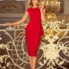 Elegant midi dress with asymmetrical basque and short sleeves in red. Dress optically slims waist and hides the imperfections around the hips. Numoco brand.