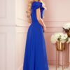 Long dress with neckline and ruffles on shoulders. Dress in cornflower blue. Brand numoco. Made in Poland.