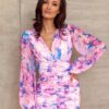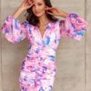 The top of the dress is an overlapping V neckline, which also gently accentuates the back. The long, buffeted sleeves, which give the whole look classy and chic, are finished with an elastic band. The cut-off under the bust emphasizes and slims the waist, and the placed draping enhances the shape of the silhouette. The lower part of the dress is a fitted skirt characterized by a fashionable crease. Fastened with a covered zipper at the back of the dress. This model of dress is an excellent proposal as a complete styling, which is perfect for various celebrations, such as weddings, communions, birthdays, parties with friends, special banquets. The product is made and sewn in Poland.