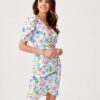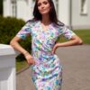 Mini dress with envelope neckline and short sleeves is made of very good quality fabric that will be comfortable to wear. The short dress is characterized by short ruffled sleeves and creases along the torso. The dress is also distinguished by its envelope neckline and overlapping bottom. It also features beautiful patterns that will appeal to everyone. The pre-knee length dress has buffets at the shoulders, which add to the overall character. This model is also characterized by creases along the torso, which optically slims the figure. Fitted dress was created for women who like to attract attention. Matching it with the right accessories, such as jewelry, handbag and shoes, you will create a beautiful evening styling. The product is made and sewn in Poland.