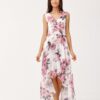 The maxi dress is made of light and delicate chiffon, which will be very comfortable to wear. The evening dress has a beautiful envelope neckline, which will optically lengthen our figure and beautifully emphasize the bust. The maxi dress is also characterized by an asymmetrical cut, which allows you to show your legs and will be an ideal model for shorter as well as taller women. The dress has a sewn-in petticoat, so the fabric will not show through. This dress model comes in beautiful floral prints. The product is made and sewn in Poland.