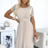 Pleated dress with round neckline, wide belt and short sleeves. Made of chiffon beige fabric on a lining. The perfect dress for any occasion. Brand numoco. European production.
