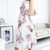 Chiffon midi dress with envelope neckline, long sleeves and belt. Dress in white with large roses. Brand numoco. European production.