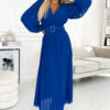 Pleated chiffon dress with neckline, long sleeve and belt. Pleating on the neckline and sleeve adds elegance to the dress. The dress comes in cornflower color. Brand numoco.