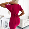 Dress with envelope neckline, short sleeves, belt and leg slit. Made of slightly stretchy fabric in fuchsia color. Brand numoco. Polish product.