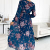 Pleated long dress with envelope neckline, long sleeves and tied belt. Made of chiffon fabric on a lining. Pattern: flowers on a blue background. The perfect dress for any occasion. Brand numoco basic. European production.