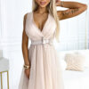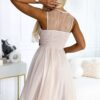 Feminine tulle dress with neckline and satin bow. The back of the dress was sewn from elastic gumonit, so it will fit most sizes. The dress comes in beige color. Brand numoco basic. European product.