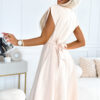 Scarlett is a classic, flared dress, ideal for many occasions. Its distinctive features include an elegant neckline and a matching belt, which emphasize the feminine silhouette. It is made of a pleasant-to-touch fabric, consisting of 95% polyester and 5% elastane, which ensures not only the comfort of wearing, but also the lightness and elasticity of the material. It looks beautiful in a muted shade of beige, giving it versatility and elegance. The Numoco brand guarantees high quality workmanship, and the fact that the dress is made in Poland testifies to the high quality of production and attention to detail.