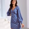 Deep neckline, long buffet sleeves finished with a button cuff. The mini length will highlight the legs in a wonderful way, and the gently flared hem will allow you to conceal minor imperfections and optically slenderize the entire figure. Fastened on the side with a covered zipper. The mini dress with an envelope neckline was created for women who like to look striking and attract their attention without too much effort. All you need to do is to choose the right footwear, and in this case the best choice will be high-heeled shoes, which will give the whole thing character. This model of dress will allow you to create an elegant, timeless styling, which is perfect for various celebrations, such as weddings, communions, birthdays, parties with friends, special banquets. The product is manufactured and sewn in Poland.
