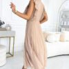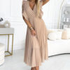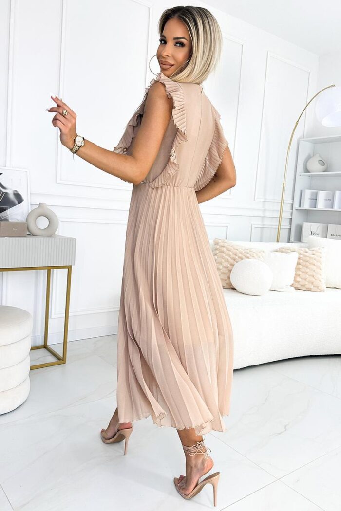 Pleated chiffon dress with a neckline and ruffles on the shoulders. The skirt is made in a trendy 7/8 length. It fastens at the back with a concealed zipper. The dress is in beige color. Brand: Numoco. Made in Poland.