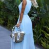 Pleated chiffon dress with a neckline and a wide belt. The pleating on the neckline and skirt adds elegance to the dress. The dress is in blue color. Brand: numoco basic.