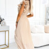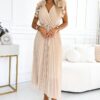 Pleated dress with envelope neckline, belt and fine ruffles. Made of chiffon beige fabric on a lining. A perfect dress for any occasion. Brand numoco basic. European production.
