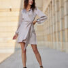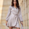 Dress made of pleasant, satin material, which looks extremely elegant. The wrap style tied at the waist will work on many silhouettes and delicately hide minor imperfections. The mini length exposes the legs and guarantees freedom. Long sleeves delicately gathered at the shoulders and finished with an elastic band, which gives a puffy effect. Catlin dress is a dress model that you can use for many occasions. Properly styled, it will be a perfect choice for more solemn events. Combined with pumps and elaborate jewelry, you will create a very elegant and feminine styling. By breaking it up with sporty sneakers, you will achieve a more casual, girly look.