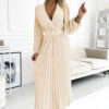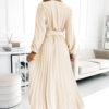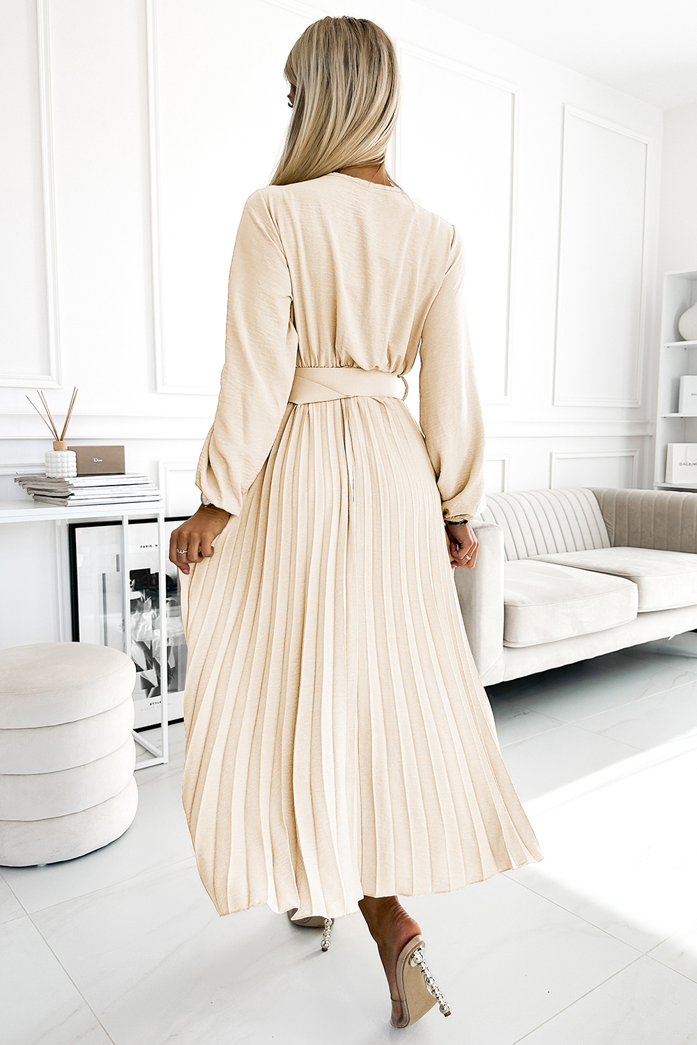 Pleated midi dress with a wrap neckline. The elegant and timeless VIVIANA dress is the perfect choice for any occasion. The wrap neckline beautifully accentuates the silhouette, while the long sleeves add class and comfort. The wide belt emphasizes the waist, giving the whole a feminine character. The dress is made of a light, crinkled material in a shade of light beige, which subtly drapes in motion.