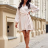 Dress made of pleasant, satin material, which looks extremely elegant. The wrap-around style tied at the waist will suit many silhouettes and delicately hide minor imperfections of the figure. The mini length exposes the legs and guarantees freedom. Long sleeves gently gathered at the shoulders and finished with an elastic band, which gives a puffy effect. The Catlin dress is a model that you can use for many occasions. Properly styled, it will be a perfect choice for more formal events. Paired with heels and statement jewelry, you will create a very elegant and feminine look. Breaking it up with sporty sneakers will give you a more casual, girly look.