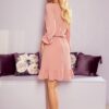 Airy dress with ruffles, neckline and elastic waistband. Made of crepe fabric in the color of dirty pink. Made by numoco. Polish production.