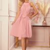 Chiffon dress with belt and tie at back. Dress in powder pink. Brand numoco. Polish production.