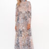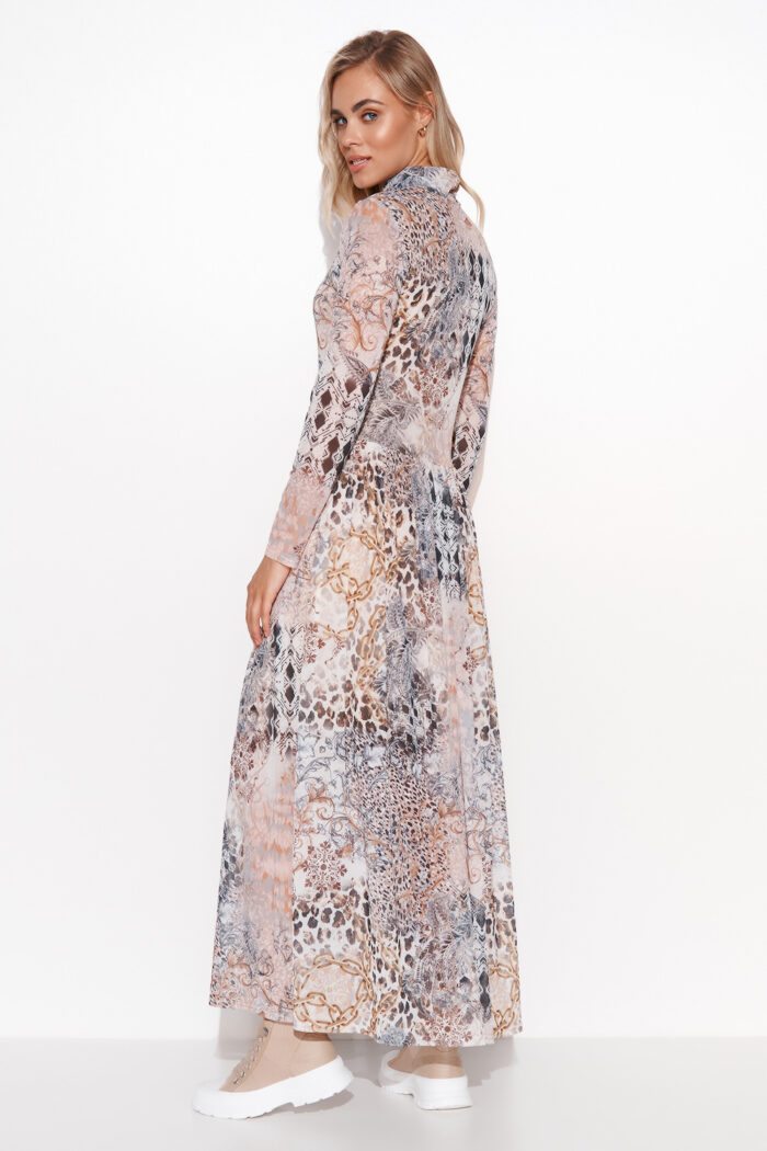 Beautiful and extremely feminine maxi dress with turtleneck, sewn from mesh. The model is available in four versions, differing in pattern and color. The dress has long sleeves. It is fitted in the upper part. For this reason, it perfectly emphasizes the bust. On the waist line it is lined with a thin seam decorated with a subtle bling. The lower part of the dress is airy, slightly draped. It is sewn from two parts: a long top and a slip before the knee. Thanks to this, intimate places are well covered, while at the arms and legs the material is slightly transparent, which gives the creation lightness.