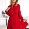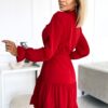 Red dress with frills, long sleeve, neckline and gold buttons. Polish production. Numoco brand.