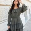 Spanish cut, with a slightly flared bottom. The model with ruffles at the neckline, sleeves and at the bottom. The attention will also not escape the elastic waistband, which emphasizes the waistline. The top of the dress is designed in such a way that it does not slip, and thus perfectly fits the figure. This model is equipped with striking sleeves, which look very stylish and elegant at the same time. The frills at the bottom will add grace to the whole. The length is before the knee. The dress with long sleeves comes in several beautiful shades. The product is made and sewn in Poland.