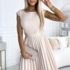 Pleated dress with short sleeves and a belt. Fastened at the back with a covered zipper. Dress in beige color. Brand numoco. Polish production.