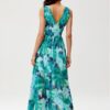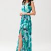 The chiffon maxi dress is distinguished by its well-thought-out, very comfortable cut, which will allow you to feel free and comfortable at important celebrations. Thick shoulder straps provide good support, the layered neckline emphasizes the bust, and the tapered waist accentuates the waist. The dress is made of lightweight chiffon fabric and has a sewn-in lining to prevent see-through. It has a striking cutout at the back, which tastefully reveals and exposes the back. The long, freely flared skirt shyly reveals the legs through a slit on the leg. Fastened at the back with a zipper. The patterned Charlotte dress will look great with accessories in muted colors. A beige or white handbag and heeled sandals will beautifully complete the styling. Match with modest jewelry and throw on a blazer for an elegant look. The dress will be suitable for weddings, christenings, communions and summer garden parties.