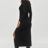 An elegant dress with modern details that add to its distinctiveness. The model is fitted, emphasizing the silhouette. It reaches mid-calf length, making it suitable for various occasions. Made of elastic, soft material that comfortably fits the body. The top of the dress has a classic, round neckline and long sleeves, adding elegance and making it suitable for cooler days. At hip height, there is a characteristic gathering in the form of horizontal folds. This detail adds a unique character to the dress and visually slims the silhouette. The dress has a clear slit at the front at thigh height, adding sensuality and allowing for greater freedom of movement. You can pair the dress with black, high flat boots, giving the outfit a bit of a rock character. It is a great proposal for evening outings or more formal occasions, for women who appreciate classic style with a modern twist.