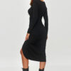 Viscose dress is an elegant pencil model in midi length that emphasizes the silhouette and adds feminine charm. The dress has long, fitted sleeves that add class and elegance. The V-neckline subtly highlights the neck and decolletage, giving it a sensual character. The entire front of the dress is pleated, which not only visually shapes the silhouette but also emphasizes its unique appearance. The dress has a tapered cut towards the bottom, which makes it fit perfectly to the body, accentuating feminine curves. The front slit adds a modern style and facilitates movement while giving the whole look a more edgy character. Paired with heavy boots, the outfit gains a bit of a rock, rebellious character. This dress is a perfect choice for evening outings or special occasions when you want to look elegant but with a touch of modern style. Pleats and the slit add expressiveness, and the fitted cut perfectly accentuates femininity.