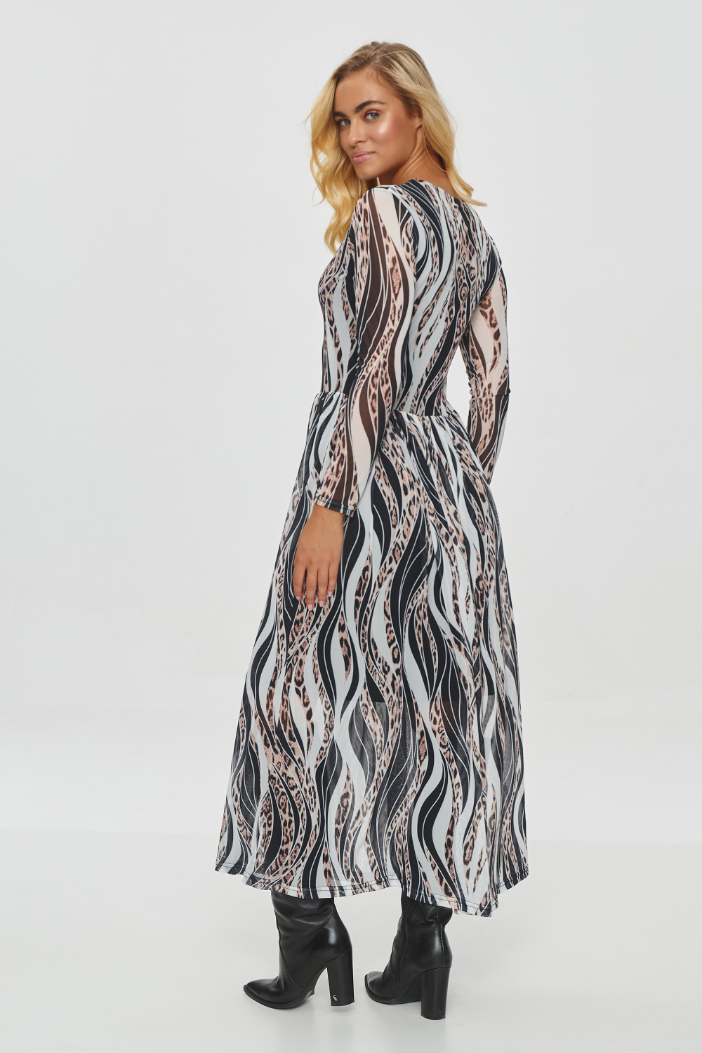 A long printed dress made of light, flowing material, giving it an elegant and romantic look. The dress pattern is a complex mixture of plant, animal, and abstract motifs, with dominant colors of black, white, beige, brown, and shades of orange. The pattern is intricate and original, adding a distinctive style to the creation. The model has a slightly fitted top that accentuates the waist, while the bottom is flared, adding lightness and movement. The finishing of the dress is subtle, and the material is semi-transparent, emphasizing its delicacy. The dress has a viscose lining that discreetly covers strategic areas and ensures comfort while wearing it. When combined with ankle boots, it creates a contrast with the delicacy of the dress, giving the whole outfit a slightly more casual look. The dress is perfect for autumn or winter evenings, thanks to its warm colors and long sleeves. The creation is available in five variants, differing in color and pattern.