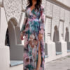 A fashionable dress that has a great cut and maxi length. A dress that you can confidently wear all year round. Very pleasant, airy and delicate to the touch material, it will work well for all kinds of figures. The dress is characterized by a safe maxi length and has a beautiful flowing cut, on which we placed a patterned motif. A delicate tapering at the waist, an interleaved neckline and a slit that will slenderize your legs, the whole thing will mysteriously enhance your charms. The dress with long buffeted sleeves has a cutout on the back with binding and a zipper closure. This model is lined with a petticoat. The dress is distinguished by the rich availability of color variations. Thanks to her, you will undoubtedly stand out from the crowd and feel very feminine. Its length and insane combination of colors will make you the star of every evening. Excellent for formal outings, it will be the perfect dress for a wedding. The product is made and sewn in Poland.
