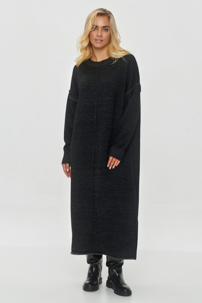 Long women’s sweater with a loose fit, made of melange pattern fabric. The sweater has an oversize cut with long sleeves, which adds to its comfort and casual style, and the lowered shoulder line perfectly masks the more massive shoulders. It is finished with wide ribs on the sleeves, so you can adjust their length while blousing them. The neckline is rounded and finished with a ribbed hem. The sweater reaches to the ankles, creating an elegant and original look, perfect for colder days. A vertical seam is visible on the front, which adds subtle detail to the sweater and optically elongates the silhouette. It is an ideal choice for autumn and winter days, going well with styling with high boots. The sweater combines comfort and style, so it can be worn both on a daily basis and for more elegant occasions.