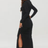 The tailored dress is a stylish and elegant creation, perfect for cooler days. It has long sleeves and a turtleneck, giving it a classic and minimalist look. The dress is fitted, emphasizing the silhouette. A characteristic element is the gathering on both sides, which adds originality and subtly shapes the figure. The dress has a slit on the side, which adds a feminine touch and makes it more comfortable to wear. The length reaches the ankles, making it an ideal choice for both formal occasions and more casual outings. The dress has stylish stitching on the front and back. The outfit is complemented by chunky, black platform shoes, giving the whole look a slightly rock character.