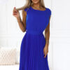 The Lila dress by Numoco is an elegant pleated creation in a navy blue color. It has short sleeves and a waist belt that accentuates the silhouette, adding a subtle charm. Fastened at the back with a hidden zipper, it ensures comfort and a perfect fit. This Polish product combines classic style with modern finishing. Perfect for various occasions.