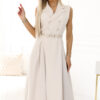 Stylish and timeless beige midi blazer is a perfect choice for women who value elegance and comfort. The shirt-like cut with buttons, a waistline, and a belt beautifully emphasizes the silhouette, while the flared bottom adds lightness and freedom of movement. The collar and V-neck add chic and subtly highlight the neck. Made of high-quality materials, it ensures comfort all day long. The universal beige color goes well with many styles, making the dress suitable for both business meetings and elegant outings. Sleeveless, perfect for warmer days or as a layering piece. This product made in Europe guarantees excellent quality and attention to detail.