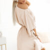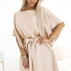 Style, comfort, and femininity in one! This butterfly-type dress in an elegant shade of dark beige is the perfect choice for any occasion, from business meetings, through dates, to family celebrations. The loose fit beautifully complements the silhouette, and the tie at the waist with a stylish bow emphasizes feminine shapes and adds lightness to the whole outfit.