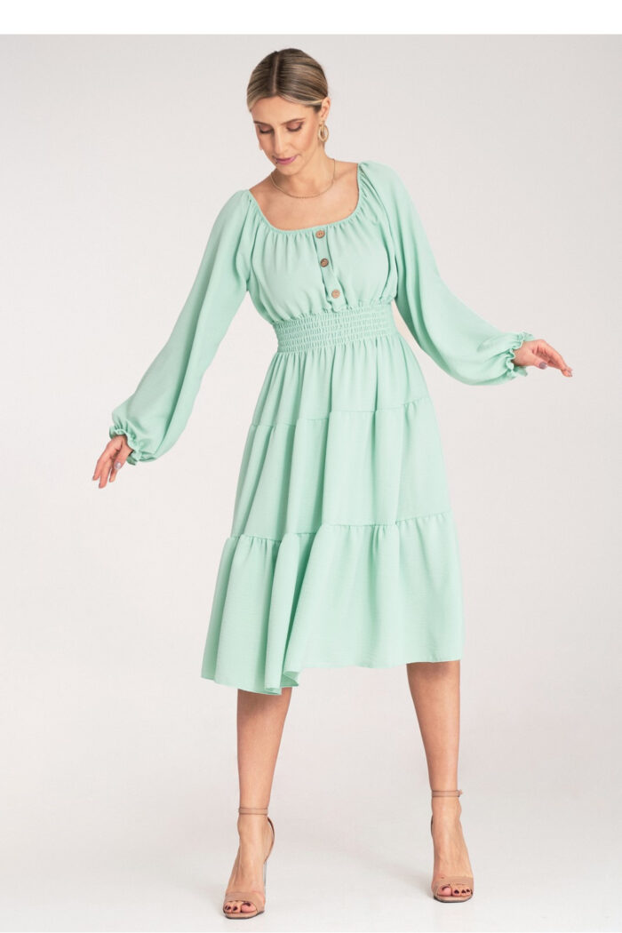 Midi dress, top ruched with a Spanish neckline. Decorated with wooden buttons and an elastic waistband emphasizing the waist.