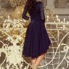 Nicolle – asymmetrical exclusive dress with a longer back, 3/4 sleeves, neckline and lace. Navy blue colour. The skirt with a longer back will be perfect for dancing. Polish production.
