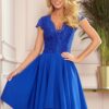 Exclusive asymmetrical dress with a longer back, short sleeves, neckline and cornflower-colored lace. The skirt with a longer back will be perfect for dancing. Made in Poland. The Numoco brand.