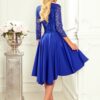 Asymmetrical blue exclusive dress with longer back, 3/4 sleeves, neckline and lace. The skirt with a longer back will be perfect for dancing. Polish production. Brand Numoco.
