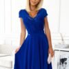 Exclusive chiffon dress with short sleeves, lace neckline and back cutout. The dress comes in cornflower color. Polish production. Numoco brand.