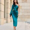 Midi dress with one long sleeve with a subtle slit at the leg is made of delicate satin fabric, which nicely adapts to the figure. On the side there is a crease, which perfectly conceals any imperfections. The original cut with one sleeve gives it a unique character. Fastened with a covered zipper on the side of the dress. This midi dress is not only elegant, but also functional. The midi length gives the dress a refined, feminine style. This dress cut will allow you to feel original by emphasizing your individual style and is sure to attract attention by making you stand out from the crowd regardless of the occasion. The product is made and sewn in Poland.